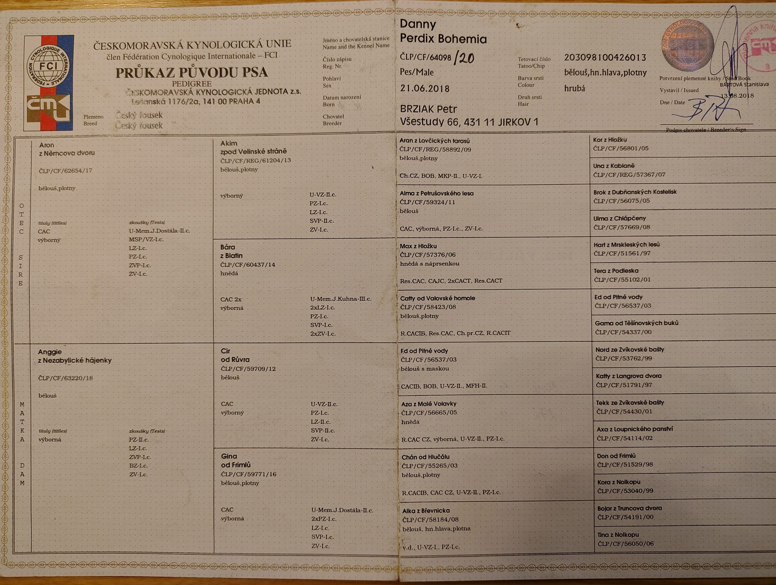 Werk diploma’s: PZ-I, ZV-I, VP-I, LZ-I, VZ-II Show: Cesky Junior Sampion, 6x Uitmuntend 2x CAJC, 2x CAC Gezondheid: HD-A, ED-vrij, schouder OCD-vrij
